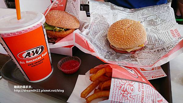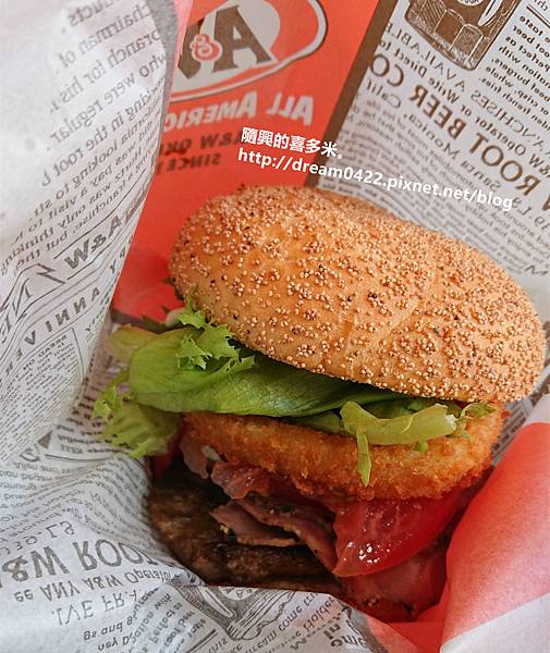 The A&W Burger:生菜/洋蔥圈/番茄/Cream Cheese/黑胡椒豬肉/漢堡肉