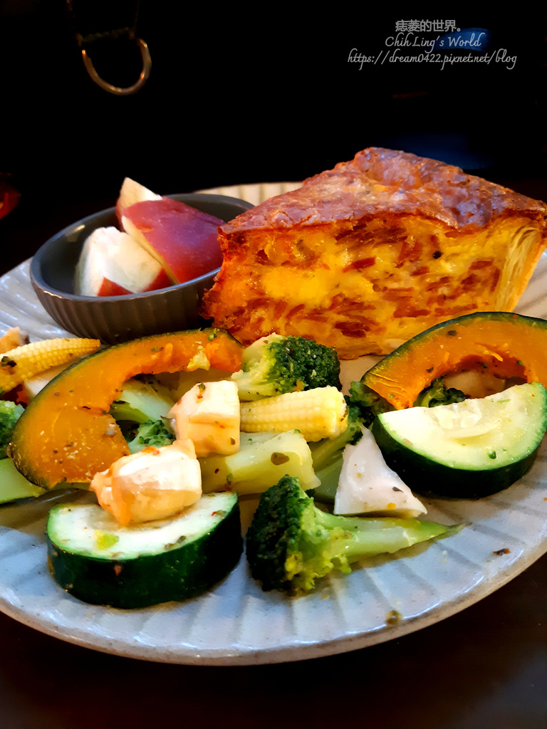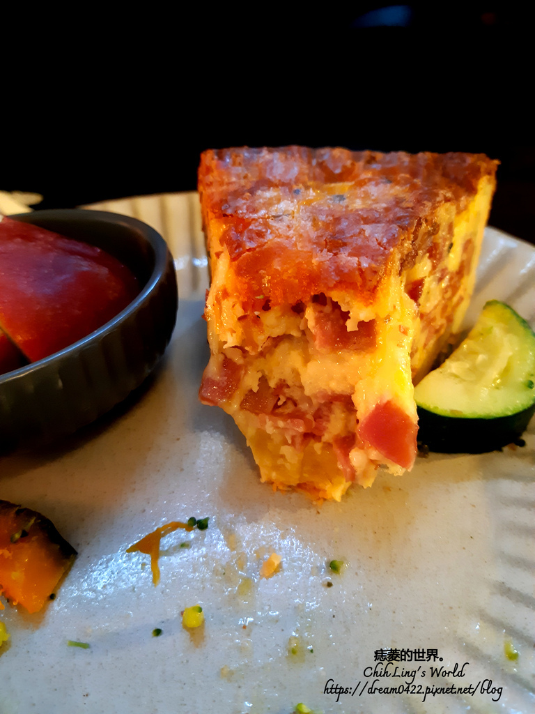 鹹派本體一入口即充滿蛋香與培根鹹香,蔬菜有南瓜、櫛瓜、玉米筍、花椰菜
