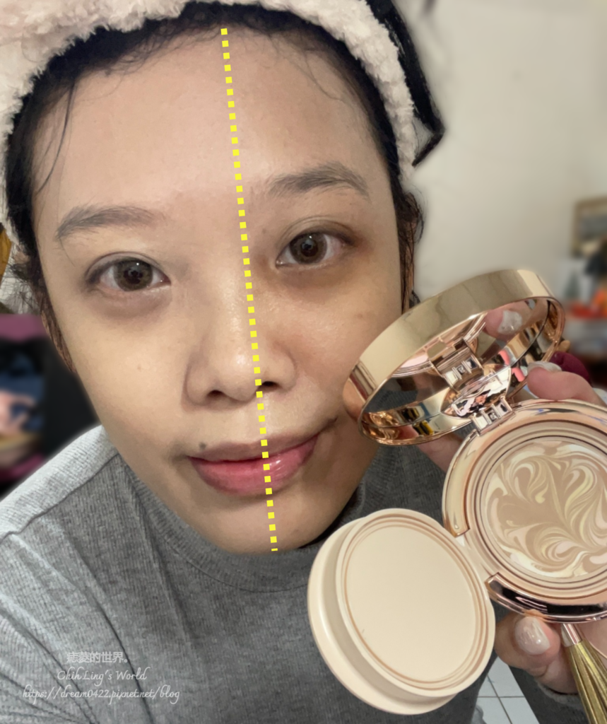 (左:使用AGE20S極光星燦彈力爆水粉餅/右:素顏)