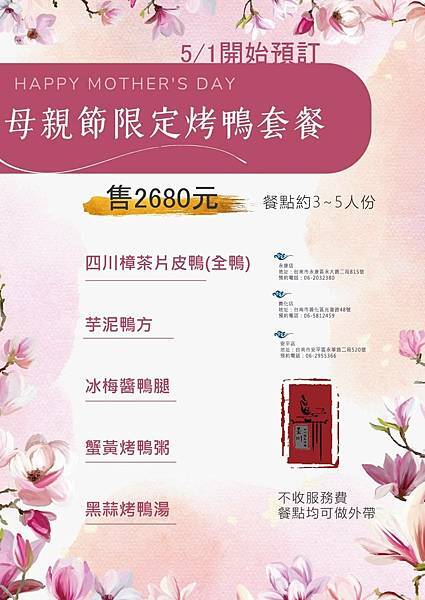 母親節限定烤鴨套餐3-5人餐 2680元、母親節六人餐 6880元、母親節十人餐 10880元,內用外帶都OK